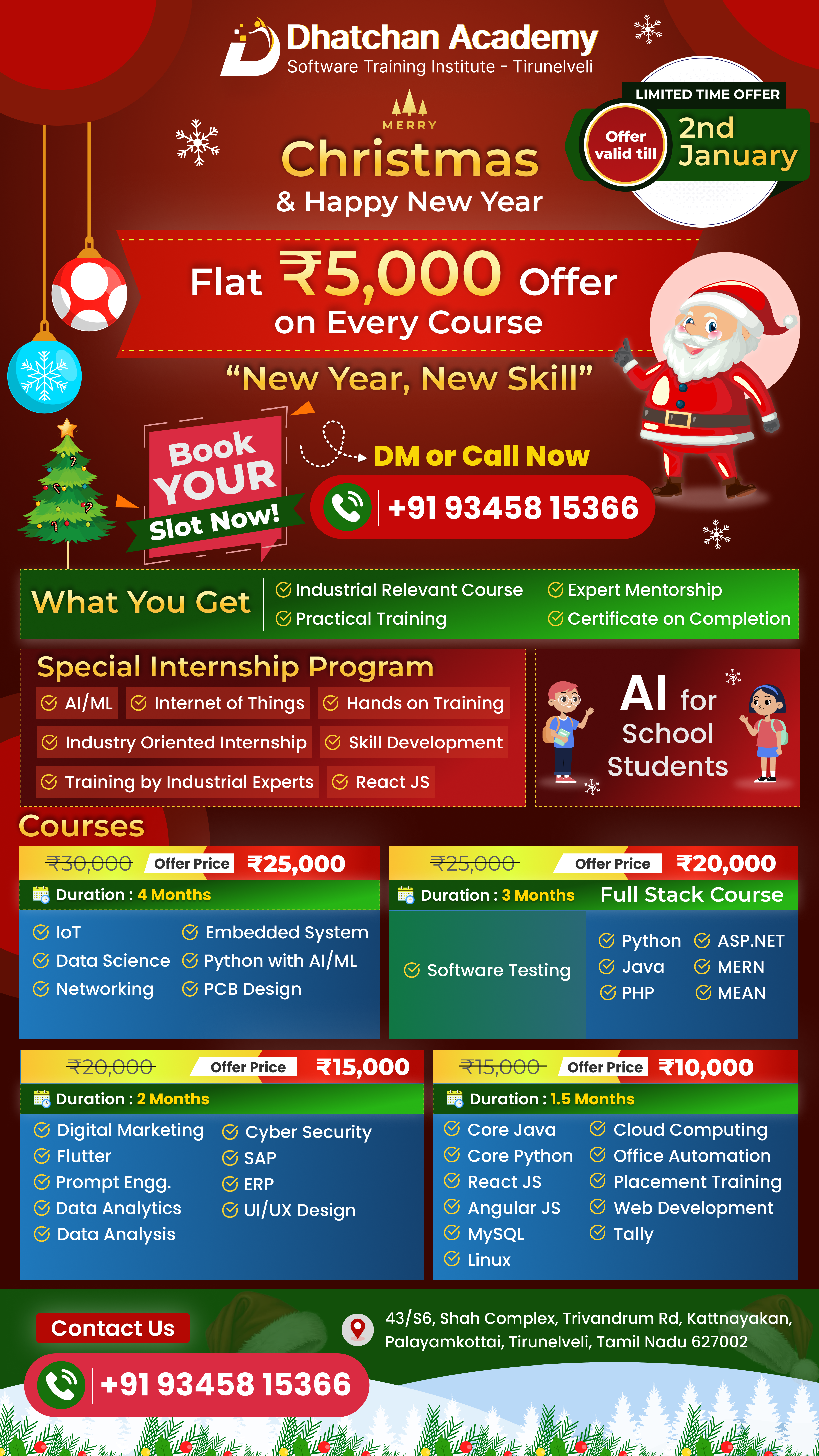 Dhatchan Training Institute, based in Tirunelveli, is a transformative initiative dedicated to fostering the IT experts of tomorrow. Our primary goal is to elevate students' potential in the field of information technology by providing a comprehensive curriculum led by seasoned IT professionals. Founded in 2022, Dhatchan Training Institute prides itself on offering in-depth, hands-on training and current industry insights. Our proficient trainers are committed to delivering the highest quality education, helping students to make substantial contributions to the IT sector.